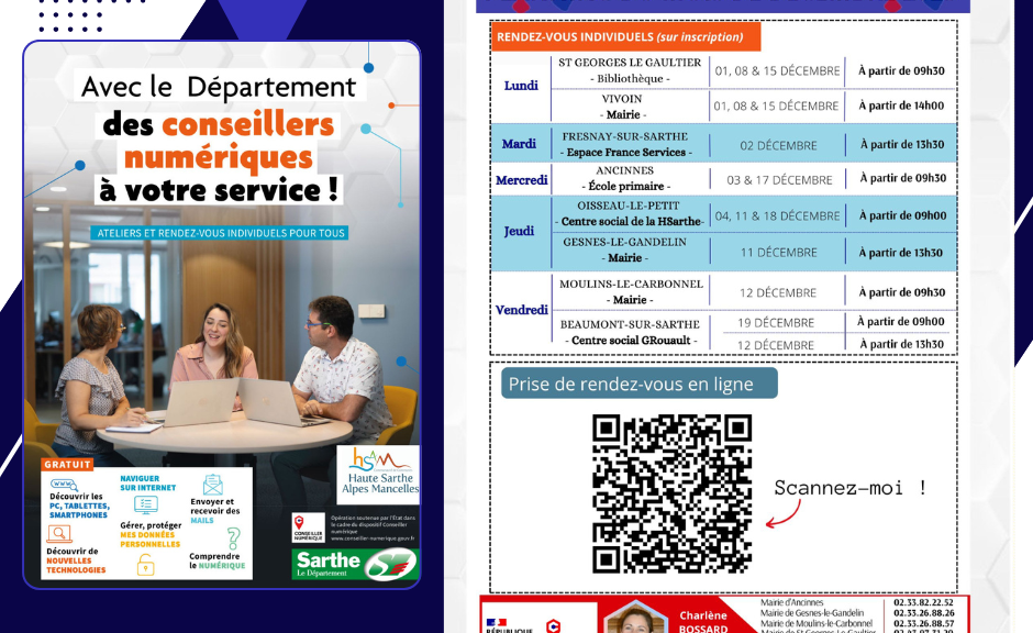 Une convention de partenariat a été signée entre la Communauté de communes Haute Sarthe Alpes Mancelles et le Conseil Départemental de la Sarthe (employeur) pour déployer l’accompagnement numérique des usagers sur notre territoire.